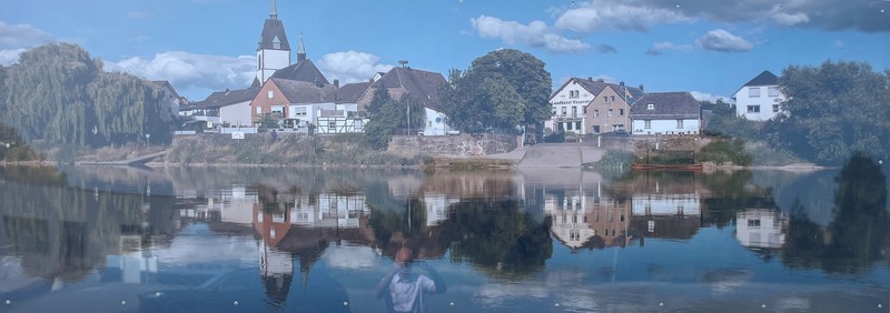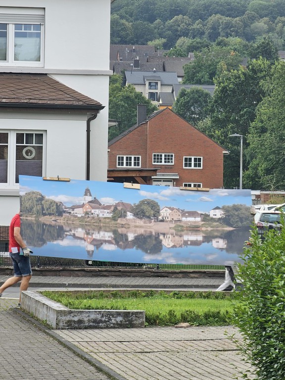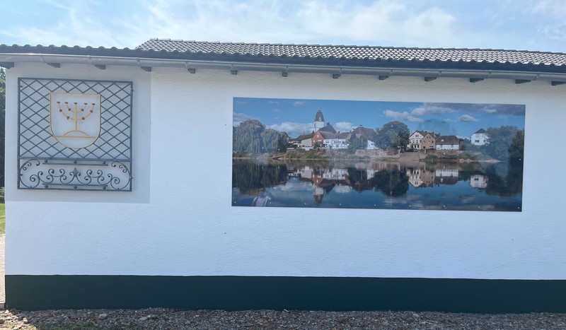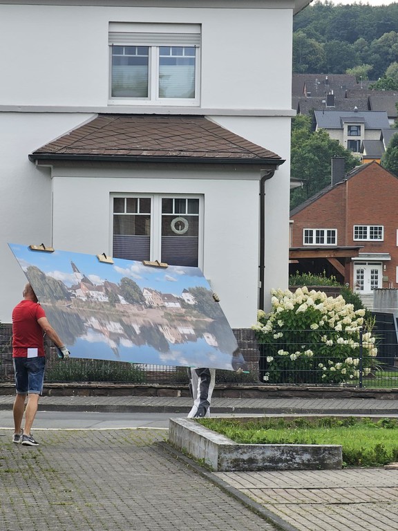hat die Schützenbruderschaft "Sankt Johannes Lüchtringen" am 11.08.2025 nach der Fertigstellung des äußeren Anstrichs ein Bild von der "Lüchtringer-Skyline" (Abmessung: B/H= 1,45m/ 4,00m) an der Vorderfront des Schützenhauses angebracht.